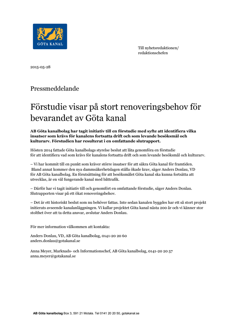 AB Göta kanalbolag har tagit initiativ till en förstudie med syfte att identifiera vilka insatser som krävs för kanalens fortsatta drift och som levande besöksmål och kulturarv. Förstudien har resulterat i en omfattande slutrapport.
