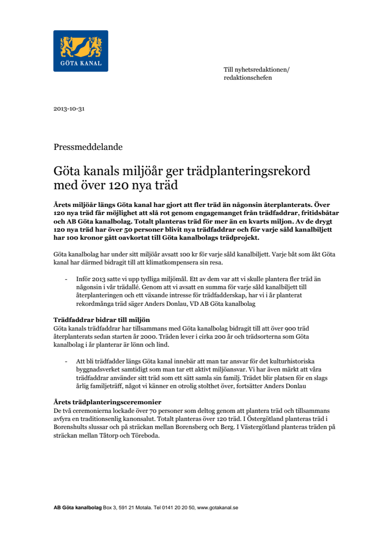 Årets miljöår längs Göta kanal har gjort att fler träd än någonsin återplanterats. Över 120 stycken nya träd får möjlighet att slå rot genom engagemanget från trädfaddrar, fritidsbåtar och AB Göta kanalbolag. Av de drygt 120 nya träd har över 50 personer blivit trädfaddrar och för varje såld kanalbiljett har 100 kronor gått oavkortat till Göta kanalbolags trädprojekt.