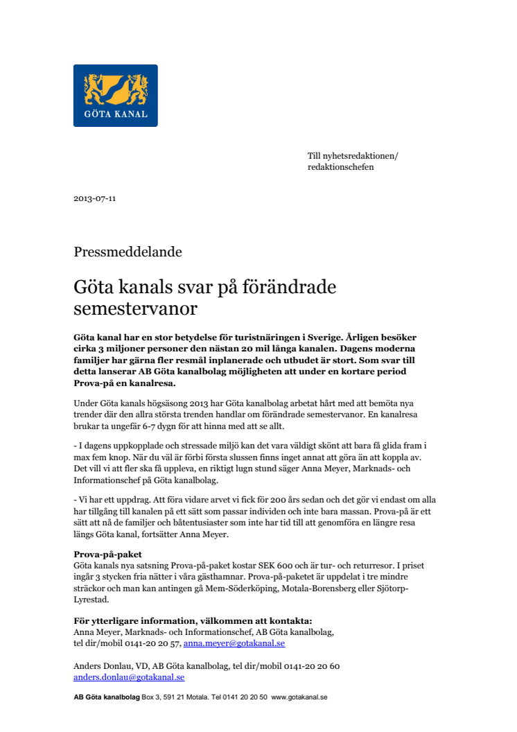 Göta kanal har en stor betydelse för turistnäringen i Sverige. Årligen besöker cirka 3 miljoner personer den nästan 20 mil långa kanalen. Dagens moderna familjer har gärna fler resmål inplanerade och utbudet är stort. Som svar till detta lanserar AB Göta kanalbolag möjligheten att under en kortare period Prova-på en kanalresa.