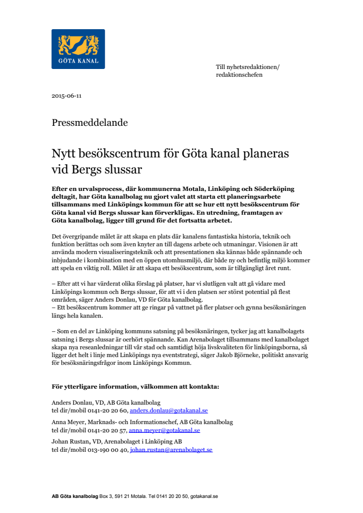 Efter en urvalsprocess, där kommunerna Motala, Linköping och Söderköping deltagit, har Göta kanalbolag nu gjort valet att starta ett planeringsarbete tillsammans med Linköpings kommun för att se hur ett nytt besökscentrum för Göta kanal vid Bergs slussar kan förverkligas. En utredning, framtagen av