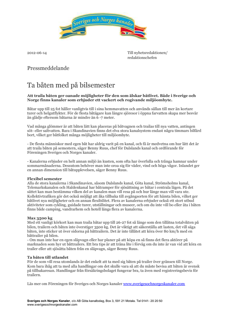 Att traila båten ger oanade möjligheter för den som älskar båtlivet. Både i Sverige och Norge finns kanaler som erbjuder ett vackert och rogivande miljöombyte. - De flesta människor med egen båt har aldrig varit på en kanal, och få är medvetna om hur lätt det är att traila båten på semestern, säger Benny Ruus, chef för Dalslands kanal och ordförande för Föreningen Sveriges och Norges kanaler.