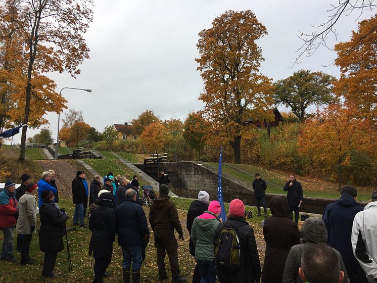Göta kanalbolags nya VD Roger Altsäter håller tal framför slusstrappan i Borenshult, Motala.