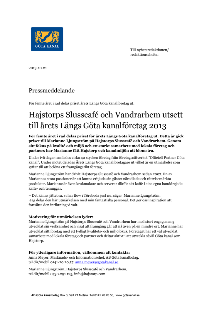 För femte året i rad delas priset för årets Längs Göta kanalföretag ut. Detta år gick priset till Marianne Ljungström på Hajstorps Slusscafé och Vandrarhem. Genom sitt fokus på kvalité och miljö och ett starkt samarbete med lokala företag och partners har Marianne fått Hajstorp och kanalmiljön att blomstra.