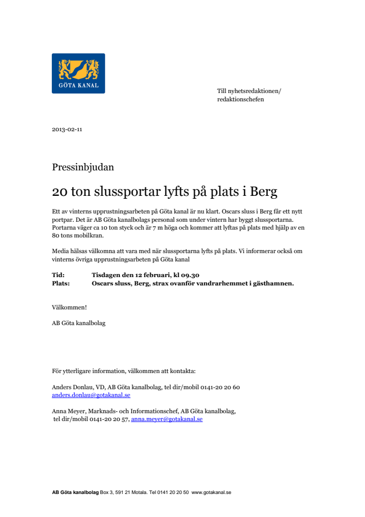 Media hälsas välkomna att vara med när slussportarna lyfts på plats. Vi informerar också om vinterns övriga upprustningsarbeten på Göta kanal.