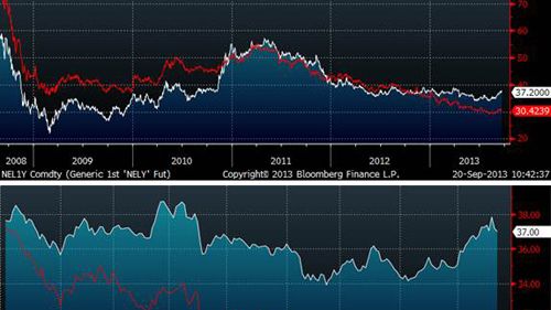 Normalt sett så är korrelationen mellan terminspriser för framtida elleveranser (i exemplet nedan Yr-14) och marginalkostnaden för kolkraftproduktion väldigt hög (Graf 1). Det finns dock undantag och det gäller perioder där den hydrologiska balansen är extrem åt endera hållet.