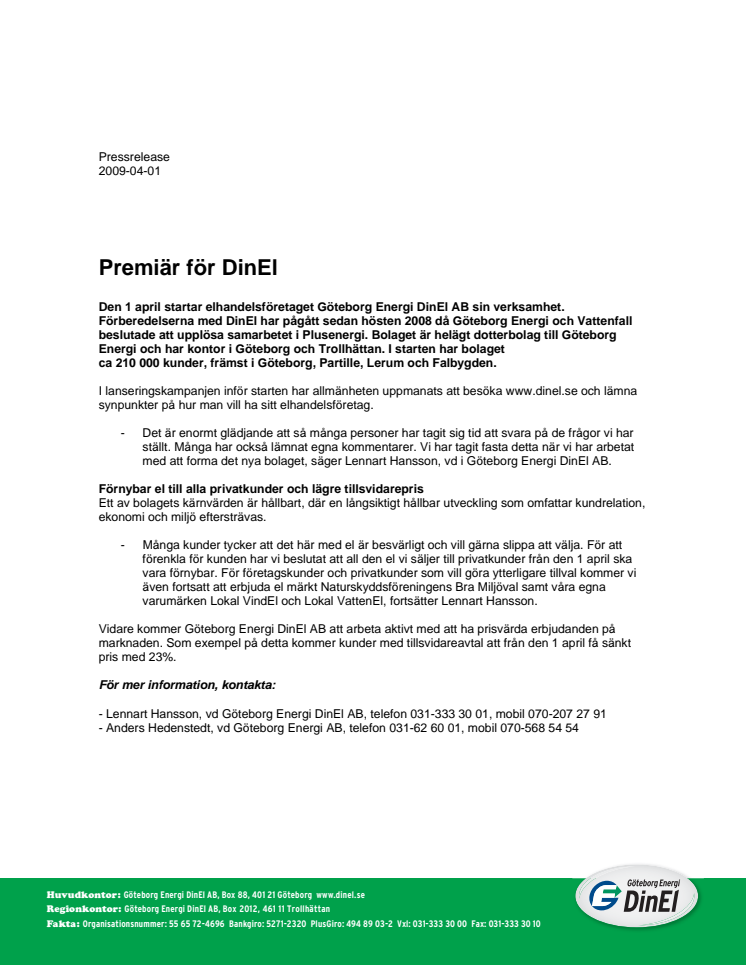 Vidare kommer Göteborg Energi DinEl AB att arbeta aktivt med att ha prisvärda erbjudanden på marknaden. Som exempel på detta kommer kunder med tillsvidareavtal att från den 1 april få sänkt pris med 23%.