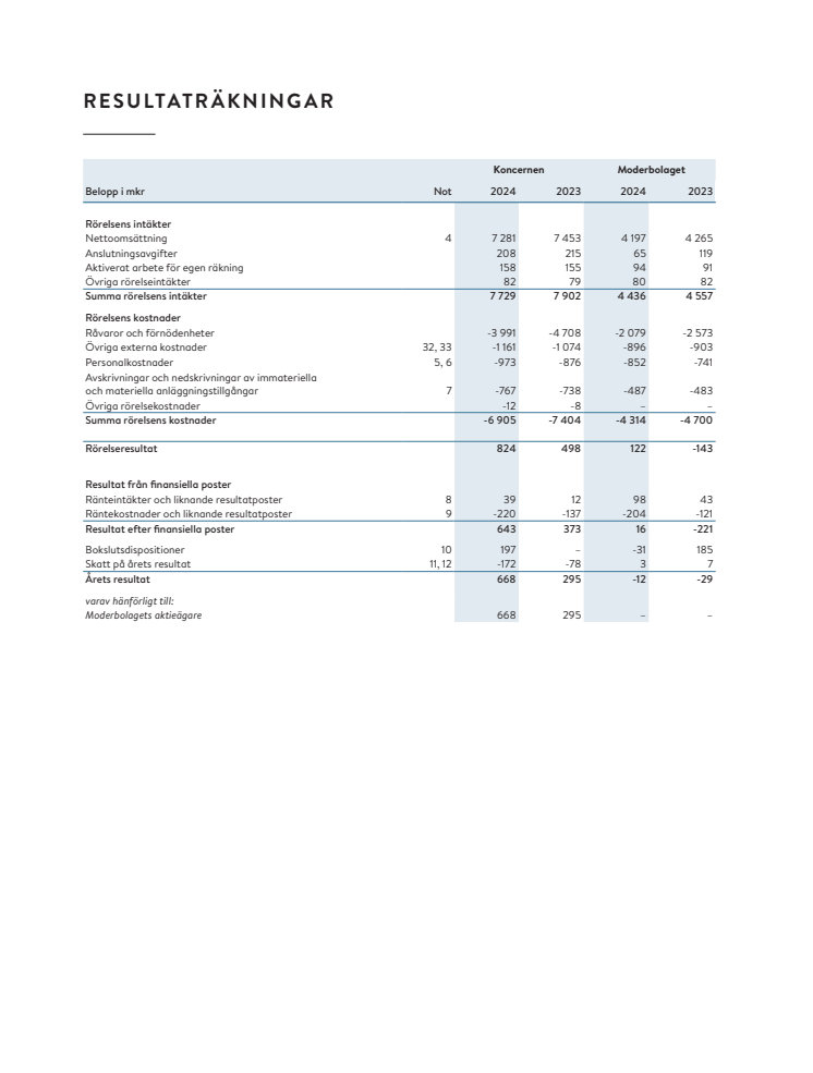 Resultat efter finansiella poster 2024 uppgår till 643 (373) mkr. Det är 270 mkr högre jämfört med 2023, en väsentlig resultatförbättring vilket ger en räntabilitet på totalt kapital om fem procent (3,1 procent). Nettoomsättningen kommer till största delen från fjärrvärme, elhandel, elnät och gashandel och uppgår till 7281 mkr (7 453 mkr), en minskning om 172 mkr. Den minskade nettoomsättningen är i huvudsak en följd av lägre elpriserna. Vi ser dock att våra kunder inom både elnät och elhandel har en högre förbrukning jämfört med föregående år.