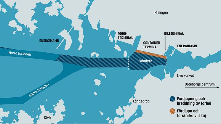 För att kunna ta emot världens största oceangående fartyg behöver farleden in till Göteborgs hamn fördjupas med cirka 4 meter och 6 km farled muddras. Cirka 13,5 miljoner kubikmeter lera kommer att behöva grävas upp och flyttas till anvisat vatten utanför Vinga. Ett område som i många år använts till deponi tack vare sitt stora djup och ackumulativa botten.