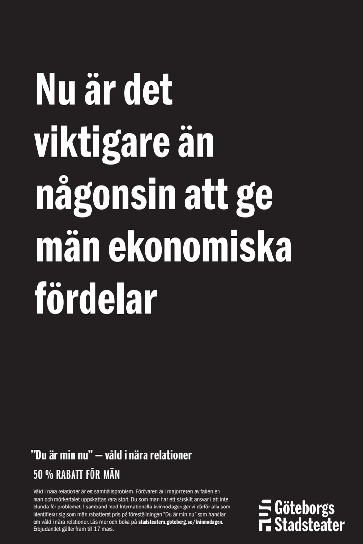 I samband med Internationella kvinnodagen lanserar Göteborgs Stadsteater en kampanj för kvinnors rättigheter och ger män rabatt på pjäs om våld i nära relationer.