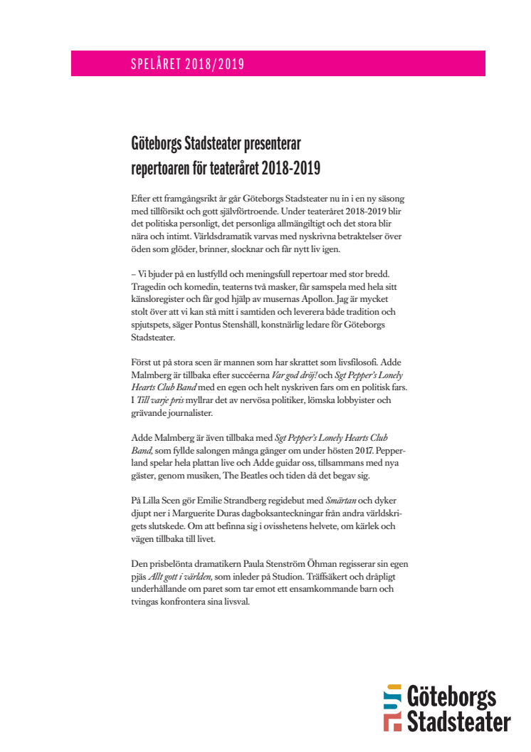 Efter ett framgångsrikt år går Göteborgs Stadsteater nu in i en ny säsong med tillförsikt och gott självförtroende. Under teateråret 2018-2019 blir det politiska personligt, det personliga allmängiltigt och det stora blir nära och intimt. Världsdramatik varvas med nyskrivna betraktelser över öden som glöder, brinner, slocknar och får nytt liv igen.