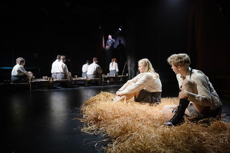 I förgrunden Josefine Johansson, Lukas Lönnbro. I bakgrunden övriga i ensemblen. (i predikstolen Ashkan Ghods).