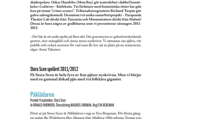 Carin Mannheimer är tillbaka med en nyskriven komedi. Koreografen Gunilla Heilborn gör för första gången en dansföreställning med enbart skådespelare. Oskar Humlebo (Moto Boy) gör teaterdebut i dubbel bemärkelse i Lubiewo – Kärleksön. Tio författare med feministiska röster har gått loss på temat ”crime scenes”. Tribunalenregissören Richard Turpin gör galen salongskomedi. Dessutom två unika samarbetsprojekt – Parapanda Theatre Lab direkt från Tanzania och Moomsteatern direkt från Malmö! Dessa är bara några av godbitarna som vi presenterar säsongen 2011-2012.