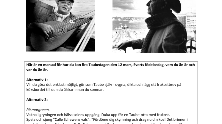 Den 12 mars är livsnjutaren Evert Taubes födelsedag. Inför den stora Taubekonserten i Göteborgs Konserthus har Stiftelsen Taubes Värld tagit fram en manual för den som vill fira diktarens minne och vårens ankomst.