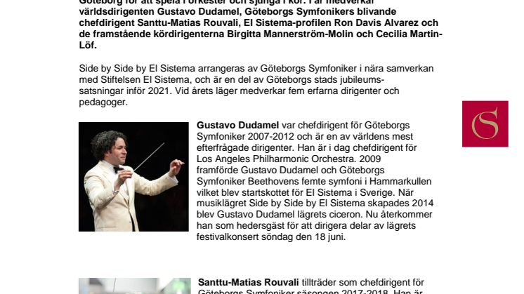 Den 14-20 juni 2017 är det för fjärde året dags för det internationella musiklägret Side by Side by El Sistema som redan nu är öppet för anmälan. Under några intensiva sommardagar samlas barn och unga från hela världen i Göteborg för att spela i orkester och sjunga i kör. I år medverkar världsdirigenten Gustavo Dudamel, Göteborgs Symfonikers blivande chefdirigent Santtu-Matias Rouvali, El Sistema-profilen Ron Davis Alvarez och de framstående kördirigenterna Birgitta Mannerström-Molin och Cecilia Martin-Löf.