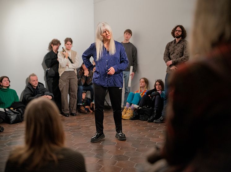 Genom andning, improvisation och vokala fantasier utforskar performance- och ljudkonstnären Cara Tolmie den kännande kroppens plats i rummet.