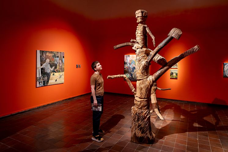 I Jonatan Pihlgrens utställning på Göteborgs Konsthall visas flera skulpturer av trä.
