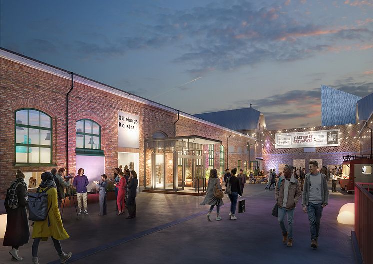 Visionsbild SWECO Architects, Göteborgs Konsthall i Slakthuset kvällstid.