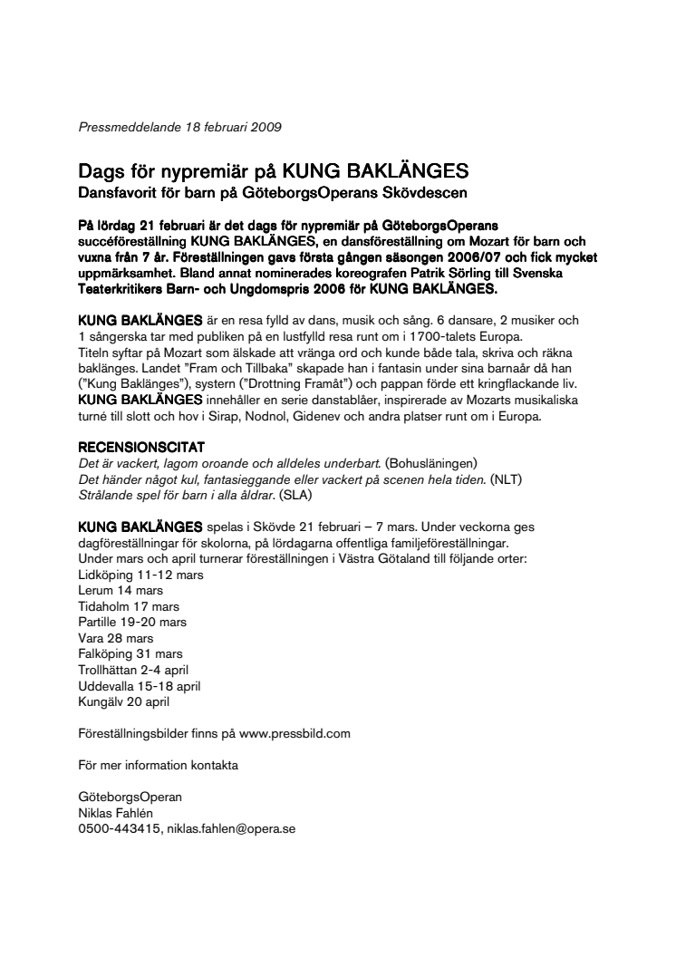 På lördag 21 februari är det dags för nypremiär på GöteborgsOperans succéföreställning KUNG BAKLÄNGES, en dansföreställning om Mozart för barn och vuxna från 7 år. Föreställningen gavs första gången säsongen 2006/07 och fick mycket uppmärksamhet. Bland annat nominerades koreografen Patrik Sörling till Svenska Teaterkritikers Barn- och Ungdomspris 2006 för Kung Baklänges.