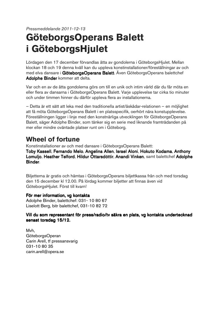 Lördagen den 17 december förvandlas åtta av gondolerna i GöteborgsHjulet. Mellan kl 18 och 19 denna kväll kan du uppleva konstinstallationer/föreställningar av och med elva dansare i GöteborgsOperans Balett.