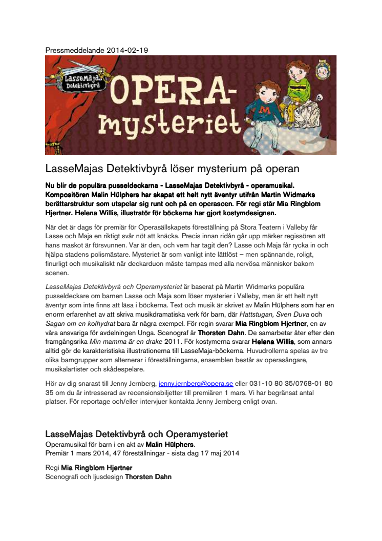Nu blir de populära pusseldeckarna - LasseMajas Detektivbyrå - operamusikal. Kompositören Malin Hülphers har skapat ett helt nytt äventyr utifrån Martin Widmarks berättarstruktur som utspelar sig runt och på en operascen. För regi står Mia Ringblom Hjertner. Helena Willis, illustratör för böckerna har gjort kostymdesignen. Premiär på GöteborgsOperan Lilla Scenen 1 mars 2014.