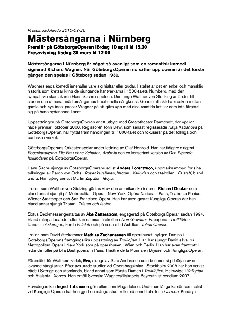 Premiär på GöteborgsOperan lördag 10 april kl 15.00