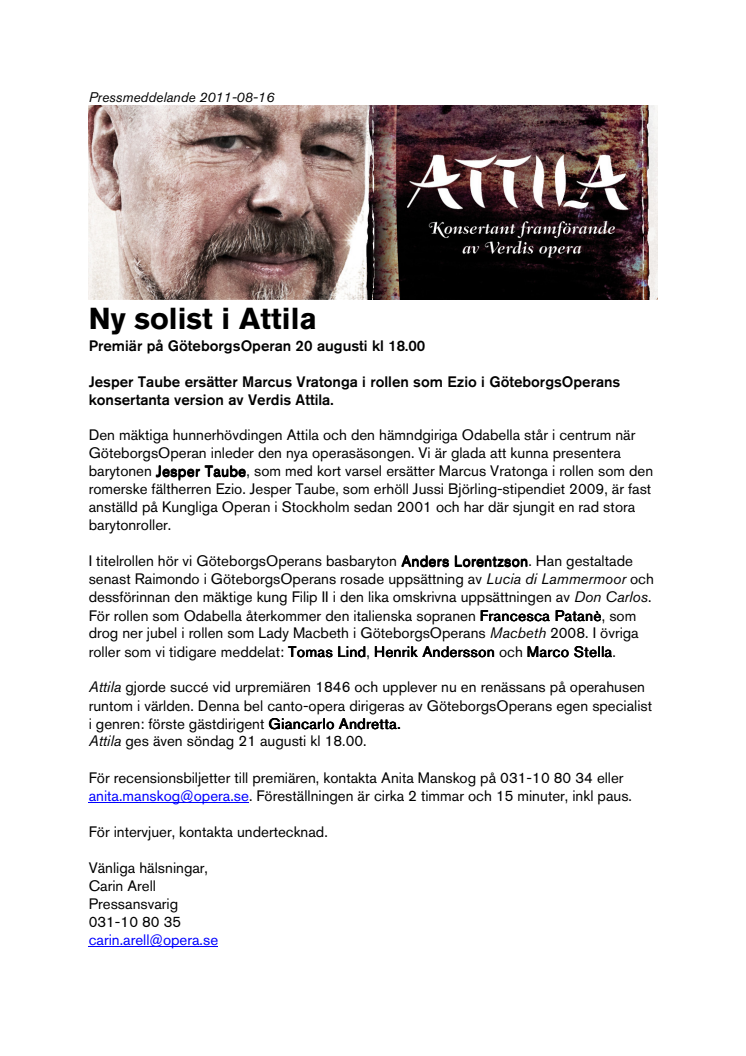 Jesper Taube ersätter Marcus Vratonga i rollen som Ezio i GöteborgsOperans konsertanta version av Verdis Attila.