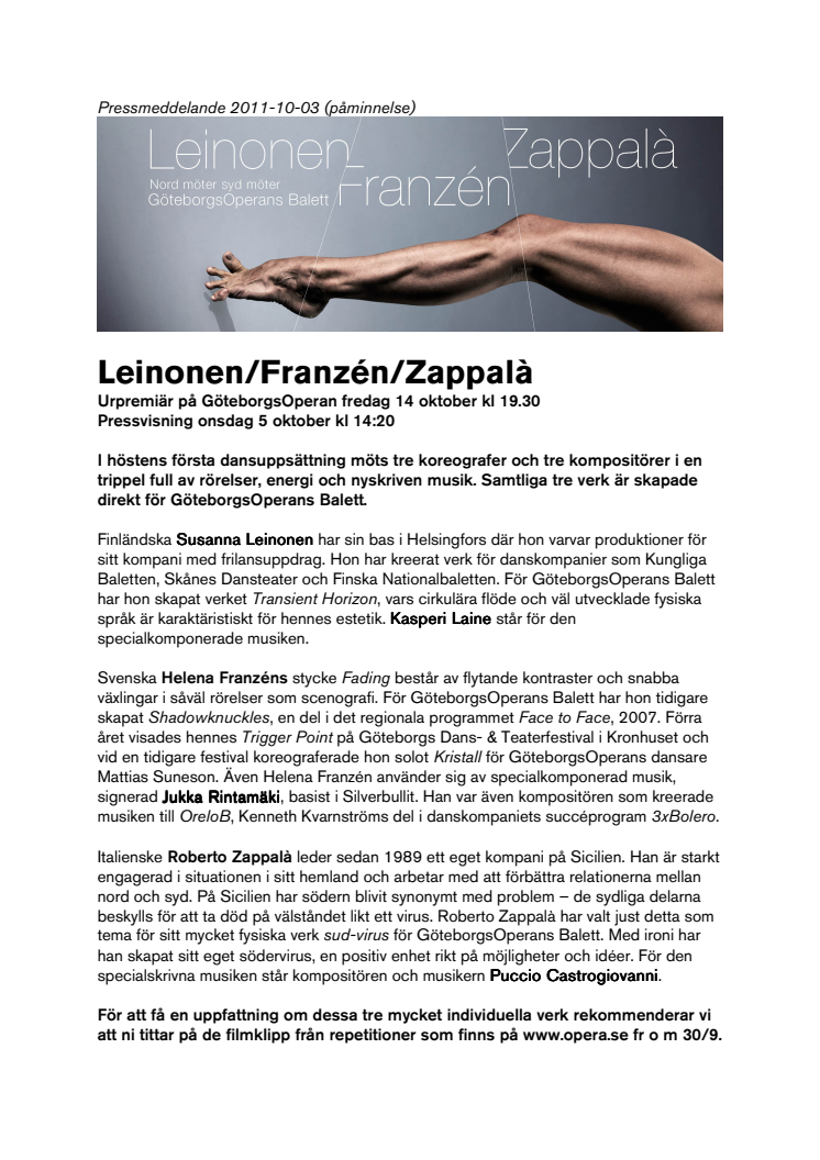 Urpremiär på GöteborgsOperan fredag 14 oktober kl 19.30