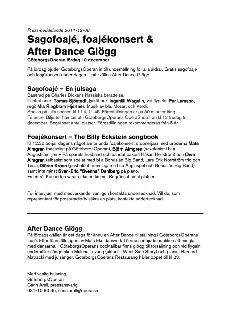 Dance Glögg På lördag bjuder GöteborgsOperan in till underhållning för alla åldrar. Gratis sagofoajé och foajékonsert under dagen - på kvällen After Dance Glögg i samband med Mats Eks dansverk Törnrosa.