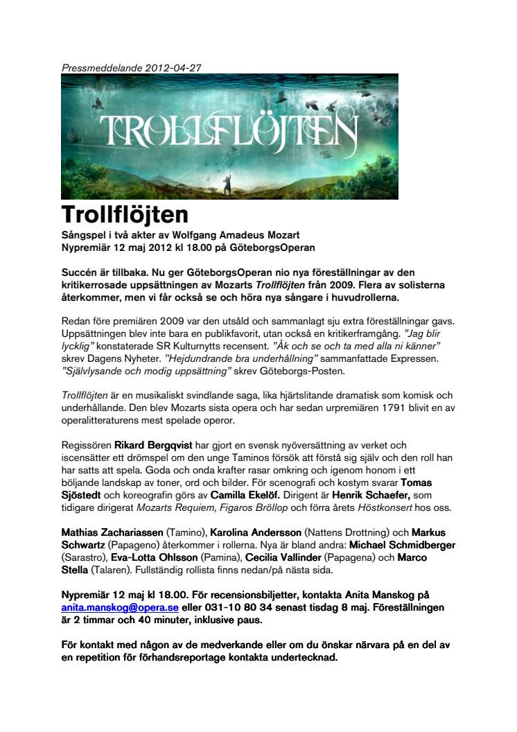 Sångspel i två akter av Wolfgang Amadeus Mozart, nypremiär 12 maj 2012 kl 18.00 på GöteborgsOperan