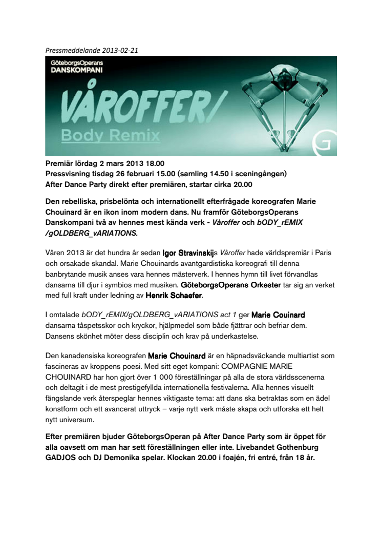 Den rebelliska, prisbelönta och internationellt efterfrågade koreografen Marie Chouinard är en ikon inom modern dans. Nu framför GöteborgsOperans Danskompani två av hennes mest kända verk - Våroffer och bODY_rEMIX /gOLDBERG_vARIATIONS.