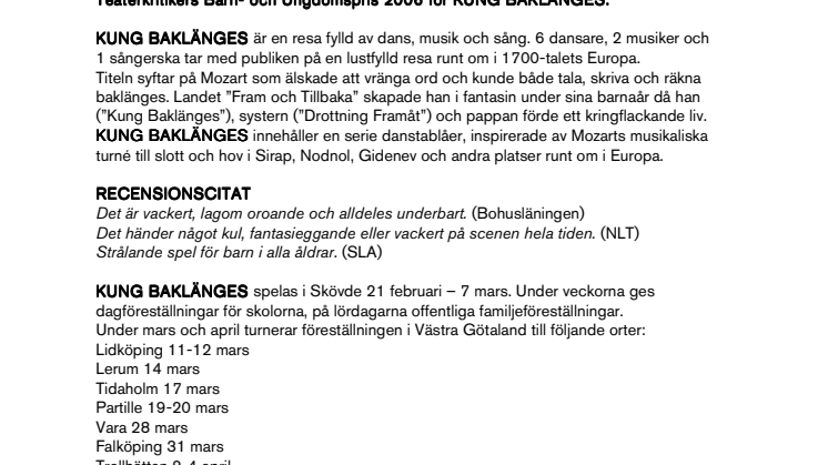På lördag 21 februari är det dags för nypremiär på GöteborgsOperans succéföreställning KUNG BAKLÄNGES, en dansföreställning om Mozart för barn och vuxna från 7 år. Föreställningen gavs första gången säsongen 2006/07 och fick mycket uppmärksamhet. Bland annat nominerades koreografen Patrik Sörling till Svenska Teaterkritikers Barn- och Ungdomspris 2006 för Kung Baklänges.