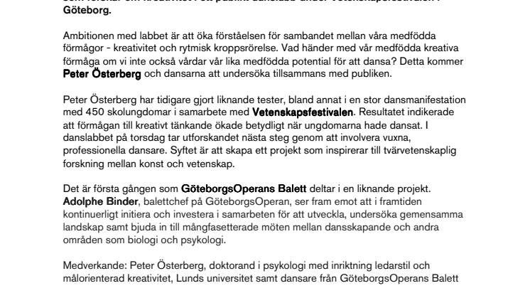 Blir vi mer kreativa av att dansa och kan dans påverka individens tankeförmåga i lärandesituationer? Dansare från GöteborgsOperans Balett möter Peter Österberg, som forskar om kreativitet i ett publikt danslabb under Vetenskapsfestivalen i Göteborg.