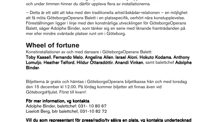 Lördagen den 17 december förvandlas åtta av gondolerna i GöteborgsHjulet. Mellan kl 18 och 19 denna kväll kan du uppleva konstinstallationer/föreställningar av och med elva dansare i GöteborgsOperans Balett. Även GöteborgsOperans balettchef Adolphe Binder kommer att delta.