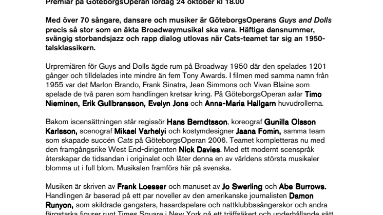 Med över 70 sångare, dansare och musiker är GöteborgsOperans Guys and Dolls precis så stor som en äkta Broadwaymusikal ska vara. Häftiga dansnummer, svängig storbandsjazz och rapp dialog utlovas när Cats-teamet tar sig an 1950- talsklassikern.