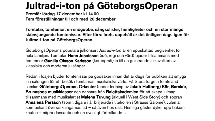 Tomtefar, tomtemor, en snögubbe, sångsolister, hemligheter och en stor mängd skönsjungande tomtenissar. Efter förra årets uppehåll är det äntligen dags igen för Jultrad-i-ton på GöteborgsOperan.