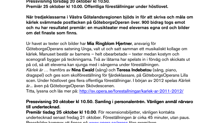 När tredjeklassarna i Västra Götalandsregionen bjöds in för att skriva och måla om kärlek svämmade postfacken på GöteborgsOperan över. 900 bidrag togs emot och nu har resultatet premiär: en musikteater med elevernas egna ord och bilder om det finaste som finns.