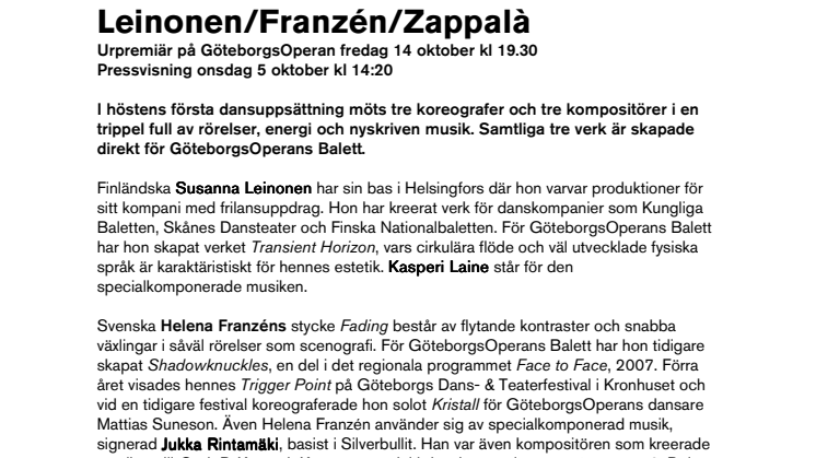 PRESSVISNING av Leinonen/Franzén/Zappalà onsdag 5 oktober kl 14.20. Samling i personalingången. Repetition av Helena Franzéns Fading på Stora scenen. Samtliga team och dansare kommer att finnas på plats. Vänligen anmäl närvaro och boka intervjuer via undertecknad senast måndag 3 oktober.
