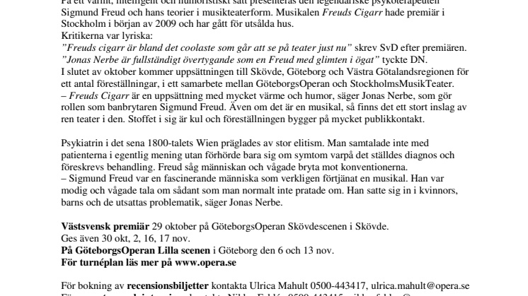 Kritikerrosade publiksuccén Freuds Cigarr blir höstens musikal på GöteborgsOperans Skövdescen i ett samarbete mellan StockholmsMusikTeater och GöteborgsOperan.