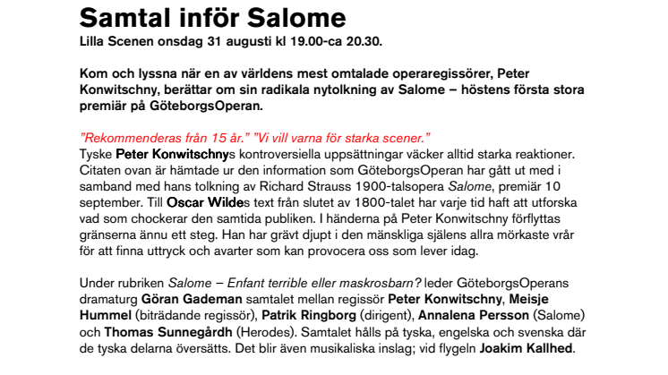 Kom och lyssna när en av världens mest omtalade operaregissörer, Peter Konwitschny, berättar om sin radikala nytolkning av Salome – höstens första stora premiär på GöteborgsOperan.
