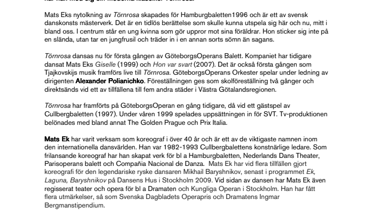 Nu återvänder den svenske koreograflegenden Mats Ek till GöteborgsOperan. Denna gång har han med sig sin moderna klassiker Törnrosa. Mats Eks nytolkning av Törnrosa skapades för Hamburgbaletten1996 och är ett av svensk danskonsts mästerverk. Det är en tidlös berättelse som skulle kunna utspela sig här och nu, mitt i