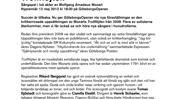 Succén är tillbaka. Nu ger GöteborgsOperan nio nya föreställningar av den kritikerrosade uppsättningen av Mozarts Trollflöjten från 2009. Flera av solisterna återkommer, men vi får också se och höra nya sångare i huvudrollerna.