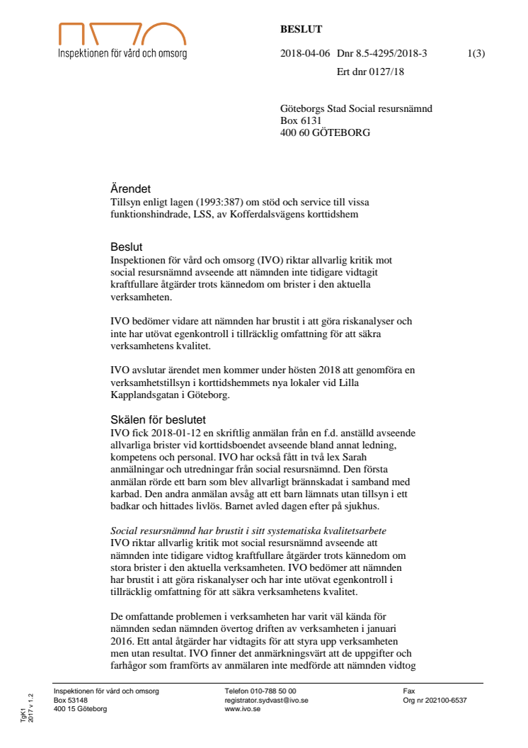 IVO:s beslut efter utredning av Kofferdalens korttidshem.