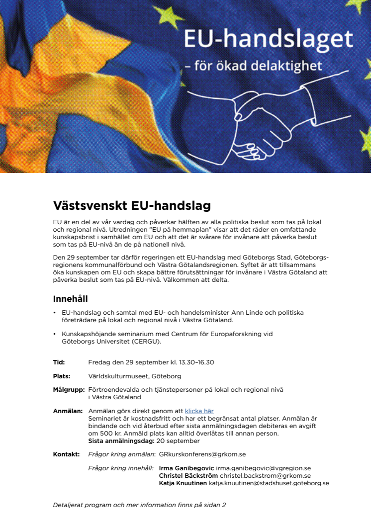 EU-handslaget den 29 september är ett initiativ från Ann Linde, EU- och handelsminister. Med handslaget vill regeringen skapa bättre förutsättningar för invånare att påverka beslut som tas på EU-nivå. De västsvenska parterna är Göteborgs Stad, Göteborgsregionens kommunalförbund (GR) och Västra Götalandsregionen (VGR).
