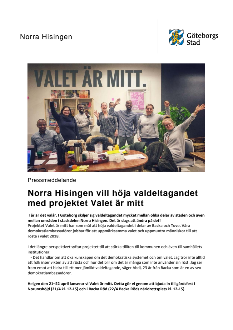 I år är det valår. I Göteborg skiljer sig valdeltagandet mycket mellan olika delar av staden och även mellan områden i stadsdelen Norra Hisingen. Detta vill förvaltningen ändra på och har startat projektet Valet är mitt. Projektet har som mål att höja valdeltagandet i delar av Backa och Tuve. Demokratiambassadörer jobbar för att uppmärksamma valet och uppmuntra fler till att rösta i valet 2018.