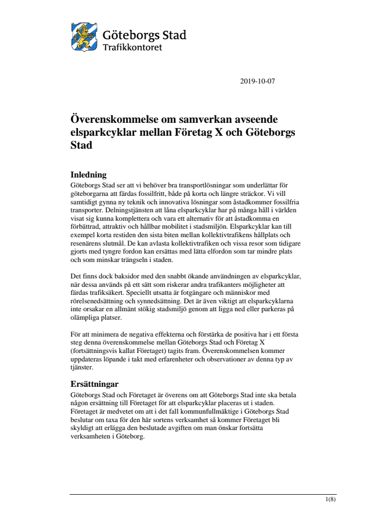 Överenskommelse om samverkan avseeende elsparkcyklar Göteborgs Stad