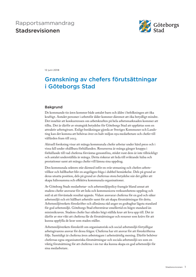 Sammandrag. Granskning av chefers förutsättningar i Göteborgs Stad (juni 2018)