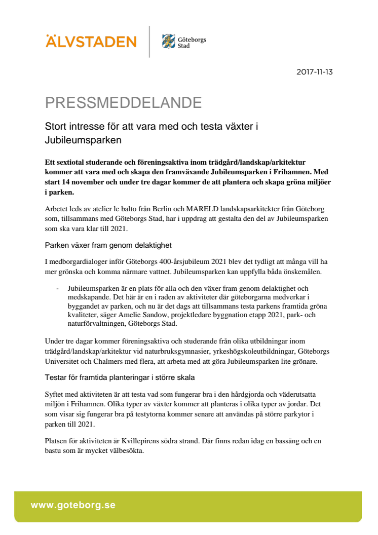 Ett sextiotal studerande och föreningsaktiva inom trädgård/landskap/arkitektur kommer att vara med och skapa den framväxande Jubileumsparken i Frihamnen. Med start 14 november och under tre dagar kommer de att plantera och skapa gröna miljöer i parken.
