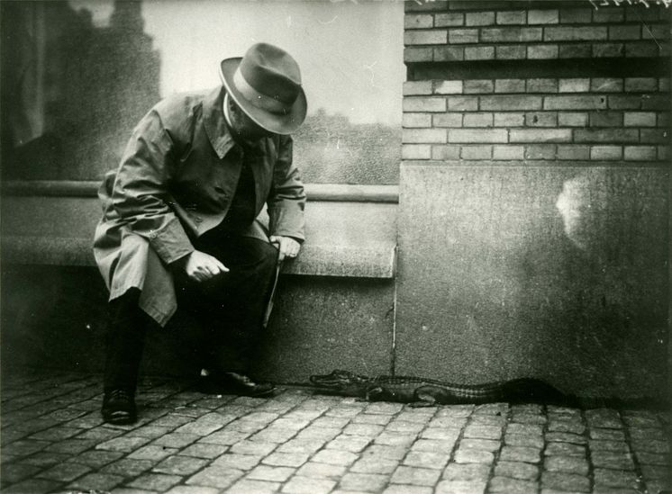 Akvariechef Hjalmar Östergren och alligatorn Smilet, 1924. Sjöfartsmuseet Akvariet.