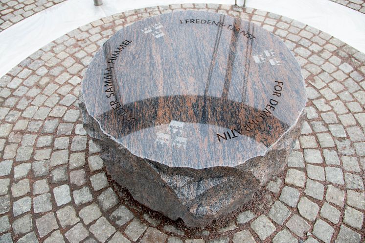 Ebba Matz konstverk för veteraner, "Under samma himmel", nyligen installerat i Färjenäsparken. Inskription på stenen: Under samma himmel, i fredens tjänst, för demokratin.