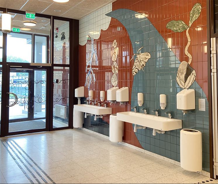 ”Grodd och fladder i vår täppa” av Moa Lönn och Karin Auran Frankenstein. Gestaltning på vägg i Bräckeskolan. Finansiär och processledare genom enprocentregeln: stadsfastighetsförvaltningen.